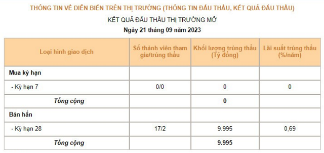 Theo kết quả đấu thầu, Ngân hàng Nhà nước đã phát hành 9.995 tỷ đồng tín phiếu với lãi suất trúng thầu đạt 0,69%/năm.
