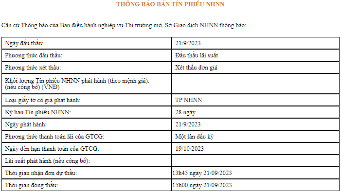 Theo thông báo, Ngân hàng Nhà nước Việt Nam phát hành tín phiếu kỳ hạn 28 ngày kể từ ngày 21/9/2023. Thời gian ghi nhận đơn dự thầu vào lúc 13h45 ngày 21/9/2023 và đóng thầu vào lúc 15h00 cùng ngày.