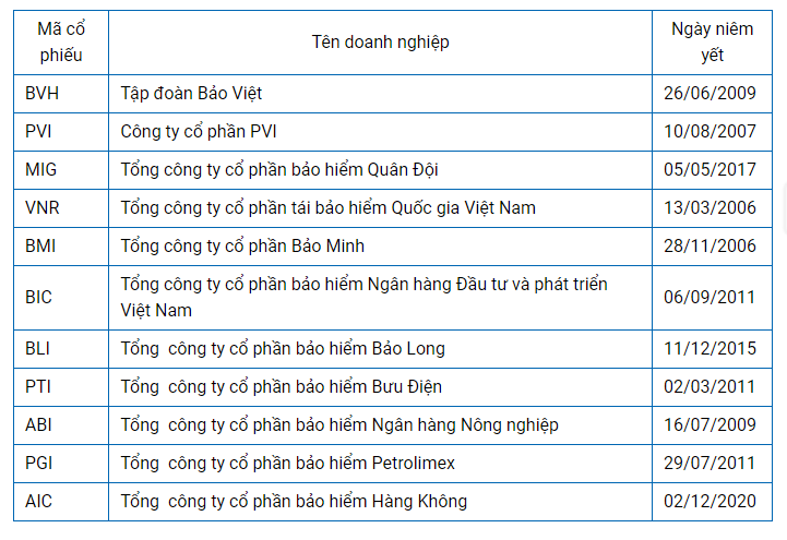 | Một số mã cổ phiếu ngành bảo hiểm niêm yết trên thị trường chứng khoán |