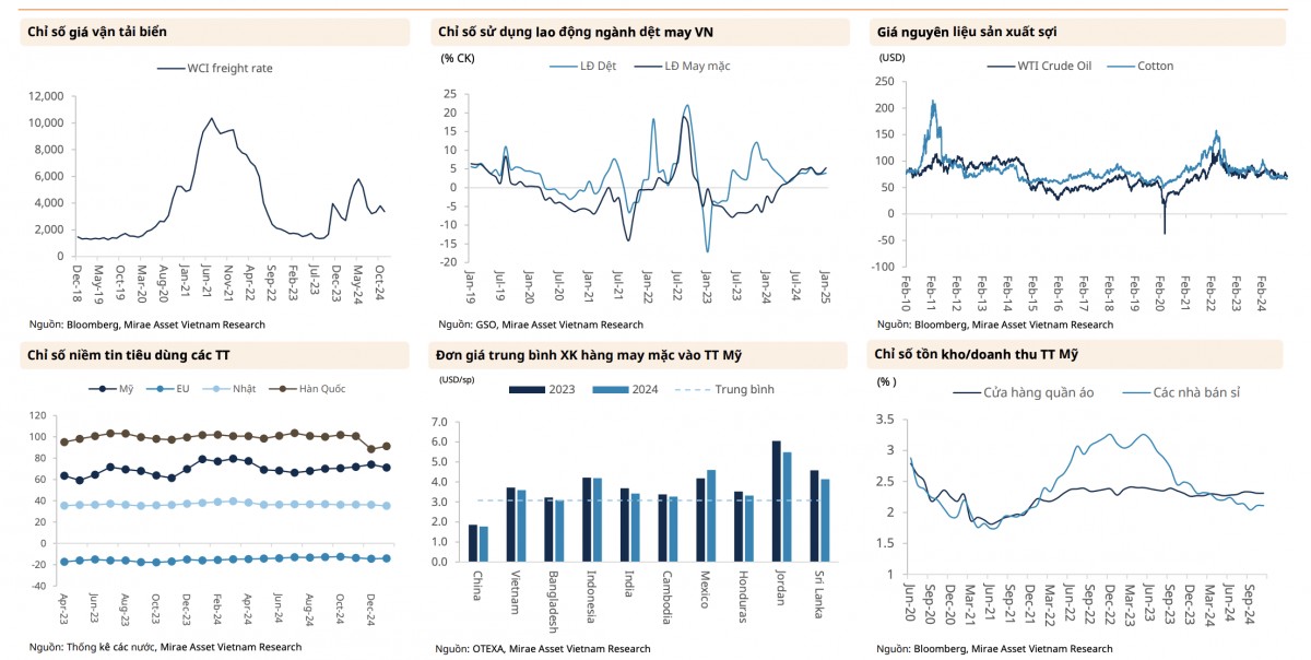 Về triển vọng, trích dẫn thống kê từ Ngân hàng Thế giới, nhóm phân tích của Công ty Chứng khoán Mirae Asset Việt Nam (MASVN) cho biết, các thị trường trọng điểm của ngành dệt may Việt Nam nhiều khả năng sẽ tiếp tục giữ vững đà tăng trưởng ở năm 2025 này, trong đó GDP của Mỹ được dự báo tăng 2,3%; châu Âu (EU) dự báo tăng 1%; Nhật Bản dự báo tăng 1,2%, và Trung Quốc dự báo tăng 4,5%. Đây là yếu tố hỗ trợ cho nhu cầu tiêu thụ hàng dệt may nước ta.