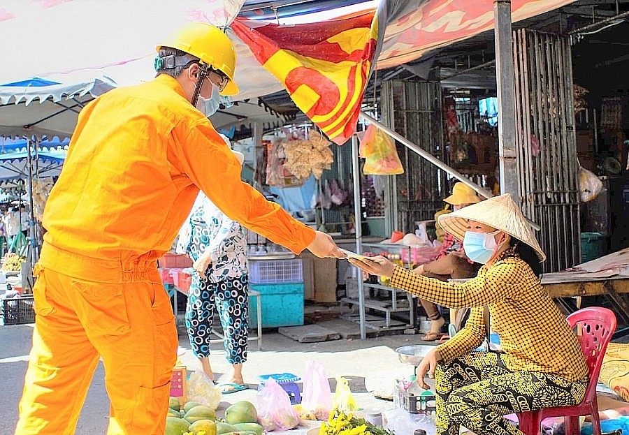 Nhân viên Điện lực miền Nam phát tờ rơi tuyên truyền sử dụng điện an toàn, phòng chống cháy nổ cho người dân |