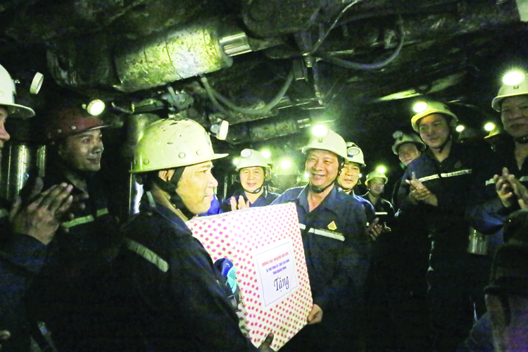 | Bí thư Tỉnh ủy Nguyễn Văn Đọc thăm và trao quà cho công nhân mỏ Hà Lầm đang làm việc ở độ sâu -300m Ảnh: Hùng Sơn |