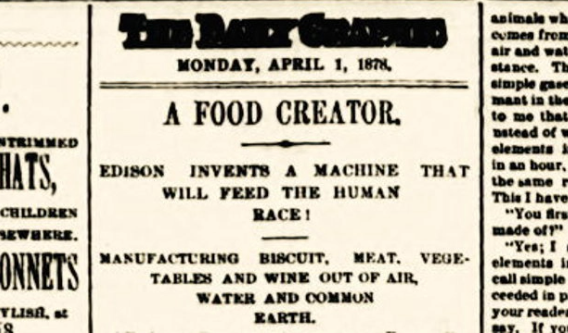 Nhà bác học huyền thoại Thomas Edison từng là "nạn nhân" trong cú lừa của tờ báo The Daily Graphic (Mỹ) năm 1878. Theo đó, tờ báo bày đã đưa tin Edison phát minh ra máy chế tạo đồ ăn tự động.