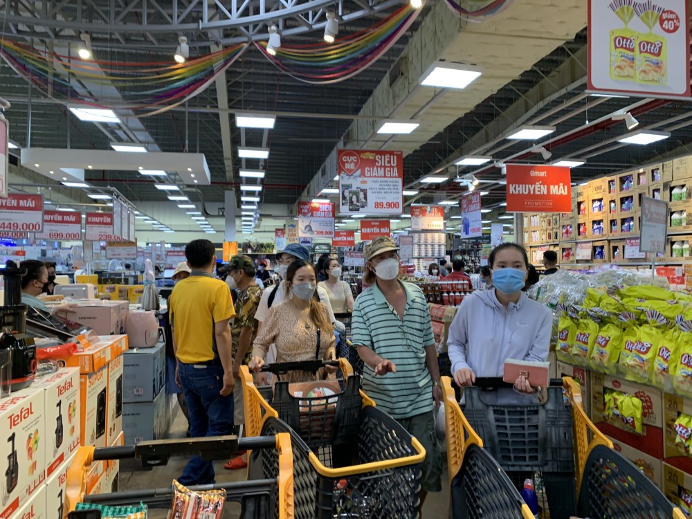 Tại các khu mua sắm như trung tâm thương mại Giga mall, siêu thị E-mart… càng về trưa lượng khách đổ về càng đông đặc biệt tại khu hàng thực phẩm như trái cây, đồ chế biến sẵn, bánh mì... lượng khách tập trung đông. Theo ghi nhận, dù khách đông nhưng không có tình trạng thiếu hụt hàng hóa. Tất cả các kệ hàng tại đây luôn dồi dào các mặt hàng thực phẩm như thịt, rau, trứng...