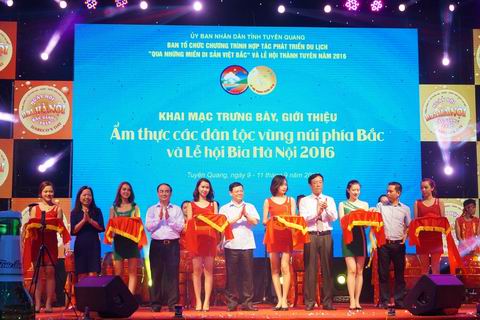 | Lãnh đạo Habeco và lãnh đạo UBND tỉnh Tuyên Quang cắt băng khai mạc lễ hội |