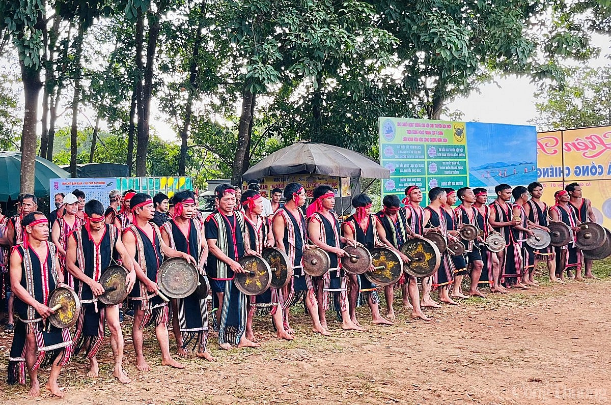 | Các đội cồng chiêng chào đón du khách đến với Hội đua thuyền độc mộc trên sông Pô Cô tranh cúp A Sanh và Liên hoan văn hóa cồng chiêng huyện Ia Grai năm 2024. |
