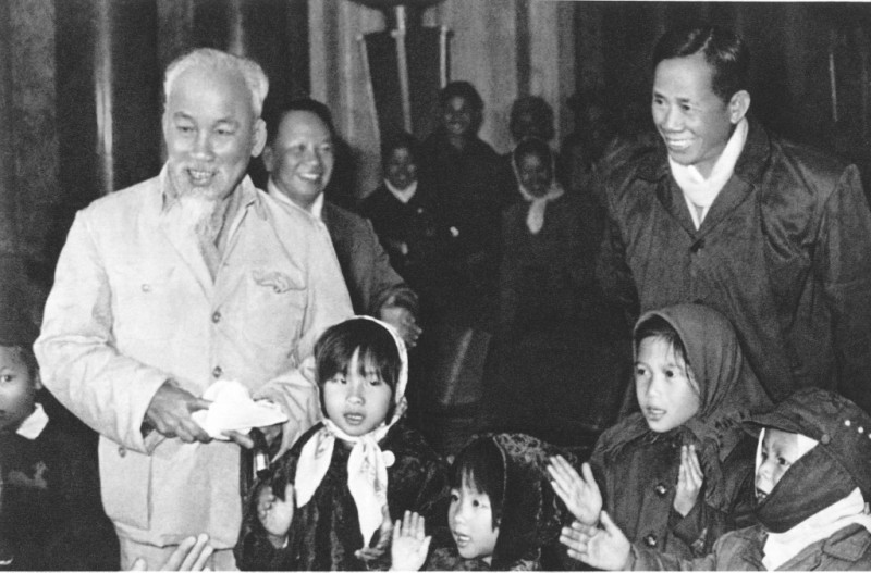 Chủ tịch Hồ Chí Minh cùng các đồng chí Lê Duẩn, Trường Chinh vui đón Xuân Mậu Thân với các cháu nhi đồng (30/12/1967) |