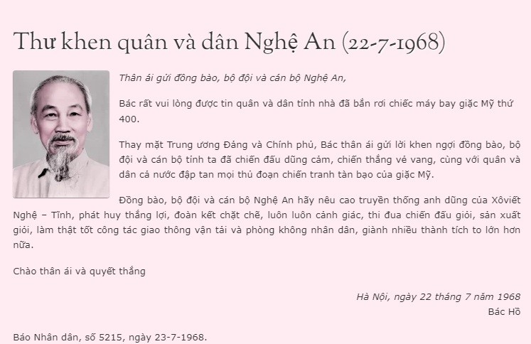 Ngày 22/7/1968, Bác gửi thư khen quân và dân Nghệ An đã bắn rơi 400 máy bay Mỹ và biểu dương: “… Đồng bào, bộ đội và cán bộ Nghệ An hãy nêu cao truyền thống anh dũng của Xô viết Nghệ - Tĩnh… giành nhiều thành tích to lớn hơn nữa”.