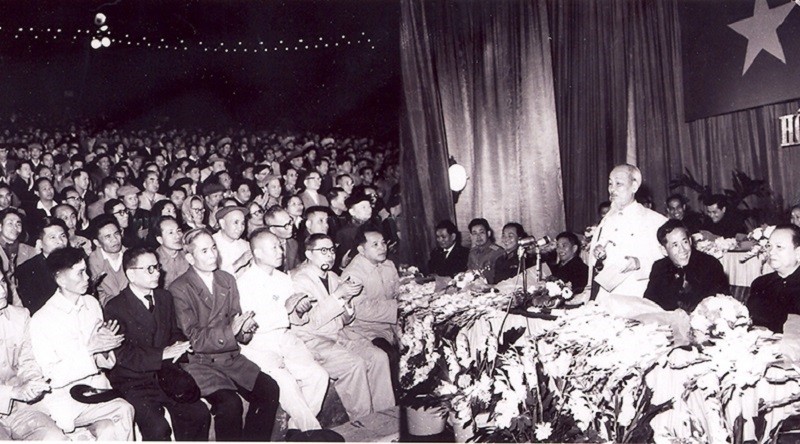 | Chủ tịch Hồ Chí Minh tại lễ kỷ niệm 35 năm ngày thành lập Đảng Lao động Việt Nam (nay là Đảng Cộng sản Việt Nam) (tháng 2/1965) |