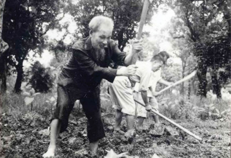 | Chủ tịch Hồ Chí Minh lao động tăng gia sản xuất cùng cán bộ, chiến sĩ (Ảnh: Tư liệu) |