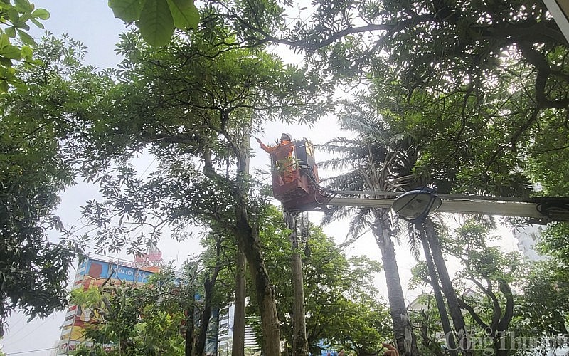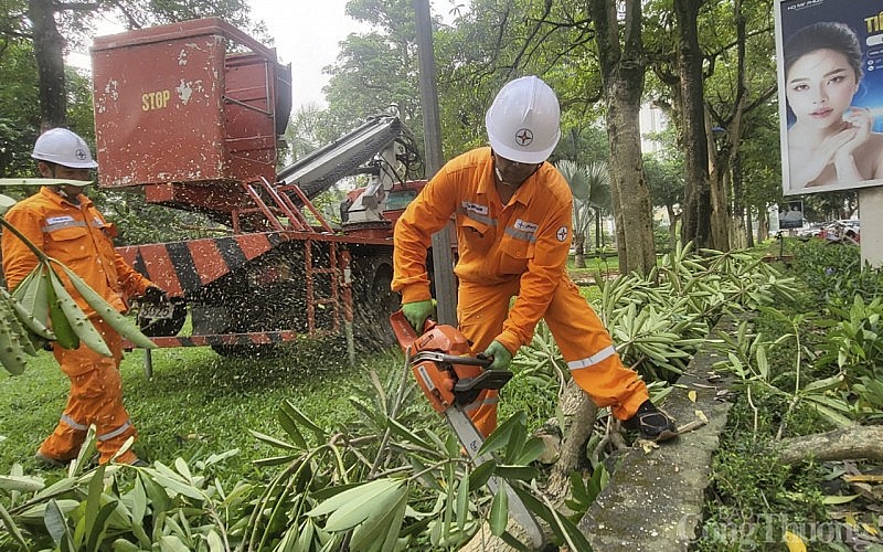 | Công nhân ngành điện tiến hành cắt tỉa cây vi phạm hành lang lưới điện, nguy cơ mất an toàn |
