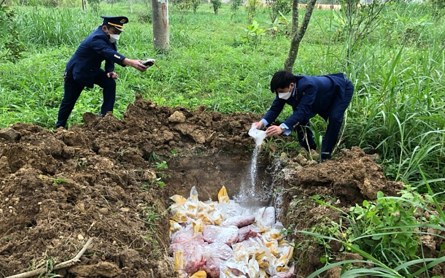 | Cơ quan chức năng tiến hành tiêu hủy lô hàng gà, lợn bốc mùi trên |