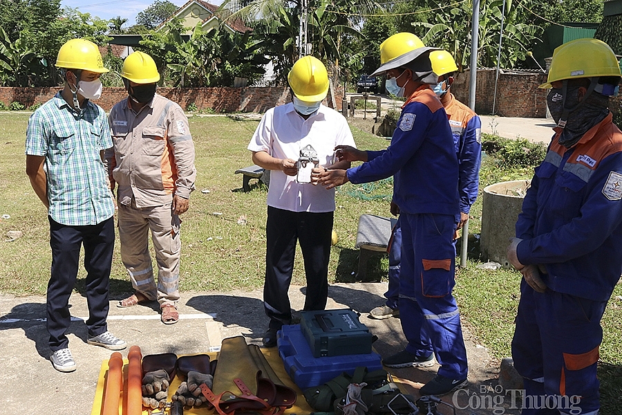 | Lãnh đạo PC Nghệ An trực tiếp xuống hiện trường động viên, kiểm tra công nhân làm việc trong thời tiết nắng nóng gần 40 độ C. |