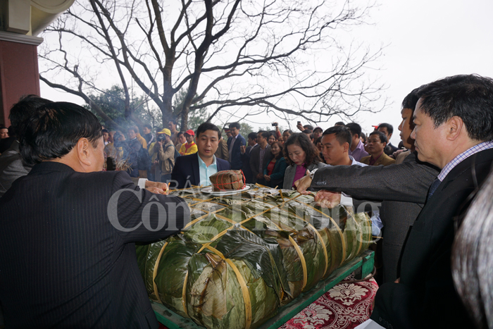 Đây là năm thứ 5 lễ dâng bánh chưng tri ân bà Hoàng Thị Loan được tổ chức. Mỗi chiếc bánh chưng có trọng lượng 350kg bao gồm nếp, đậu, thịt… Để hoàn thành chiếc bánh này, ban tổ chức đã huy động 30 đầu bếp lành nghề, sử dụng hàng trăm chiếc lá dong kết thành tấm lớn và nấu trong chiếc nồi chuyên dụng liên tục trong 2 ngày.