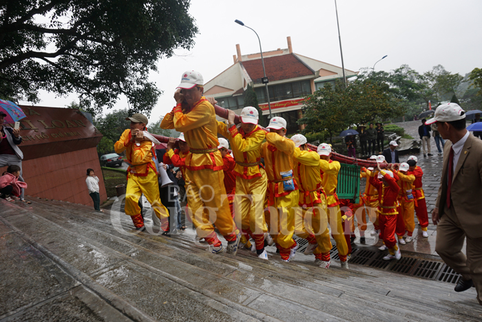 Khu lăng mộ bà Hoàng Thị Loan được xây dựng trên đỉnh núi Động Tranh (xã Nam Giang, Nam Đàn, Nghệ An). Để lên được đến khu mộ, một con đường dài hơn 1km uốn lượn theo sườn núi với hàng trăm bậc thang được xây dựng, phục vụ du khách hành hương, chiêm bái. Tuy nhiên, đây lại là thử thách không nhỏ đối với việc vận chuyển cặp bánh chưng “khổng lồ” này lên núi. Với mỗi chiếc bánh chưng nặng 3,5 tạ, được đặt trong khung sắt nặng 2 tạ, ban tổ chức phải huy động 20 thanh niên trai tráng để đưa bánh lên núi. Năm nay, thời tiết không thuận lợi, trời mưa, đường trơn đã ảnh hưởng không nhỏ đến việc vận chuyển bánh.