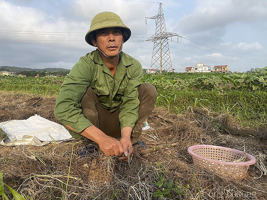 "Lần đầu tiên trong gần chục năm trồng hành, năm nay lại rớt giá thảm hại. Nếu để lâu ngoài đồng thì sợ hành lên xanh, chất lượng hành không đảm bảo, nên gia đình ông phải thêm tiền mua trấu về lấp gốc, và đào hành dần đem về nhà bảo quản, chờ thương lái đến thu mua", ông Cương ngậm ngùi.