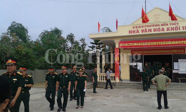 Các cử tri thuộc lực lượng vũ trang Quân khu 4, Bộ đội Biên phòng Nghệ An đến điểm bỏ phiếu số 6 phường Bến Thủy bỏ phiếu |