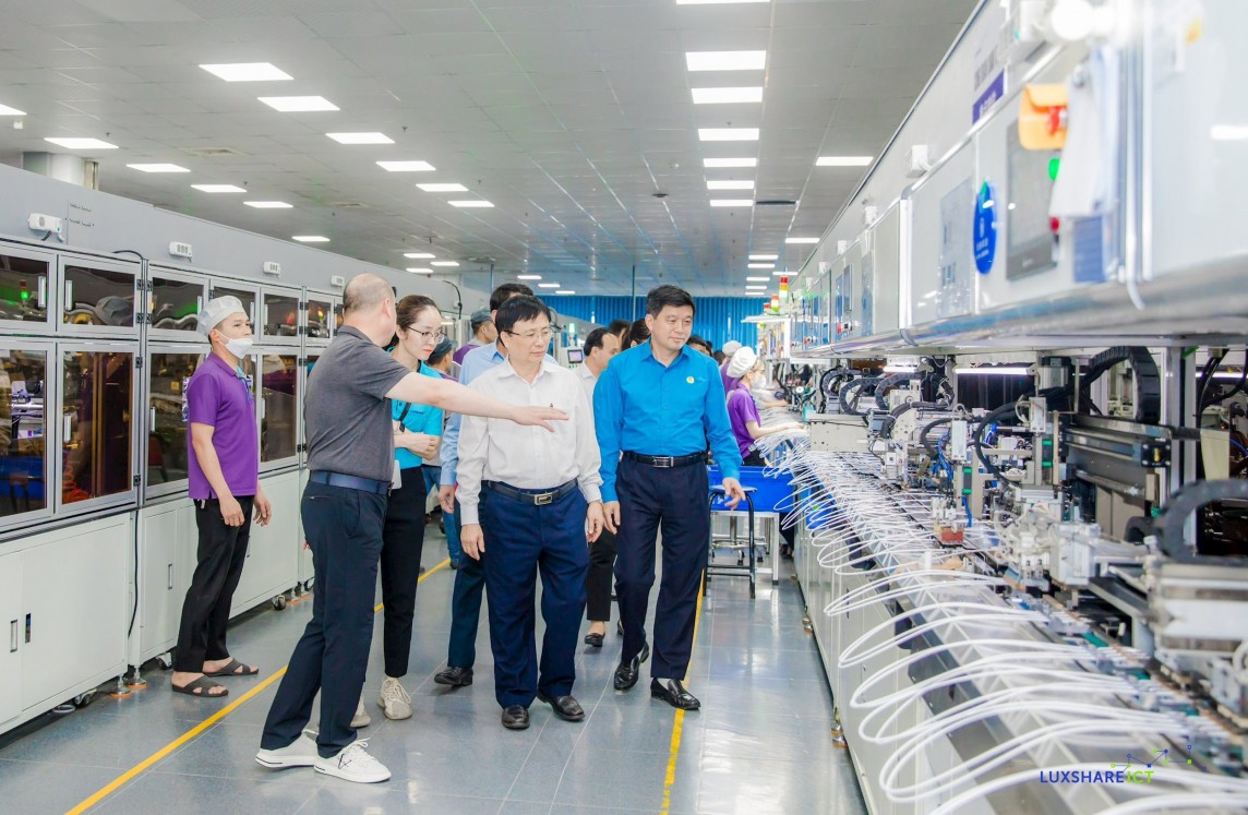 Lãnh đạo tỉnh cùng Liên đoàn Lao động tỉnh Nghệ An thăm khảo sát tình hình sản xuất tại Nhà máy Luxshare để nắm nhu cầu lao động. (Ảnh: Cơ sở cung cấp)