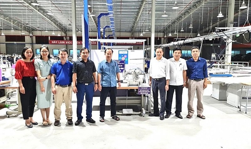Đoàn công tác kiểm tra, nghiệm thu máy tại Công ty TNHH May mặc Quang Vinh. Ảnh: Thu Huyền |