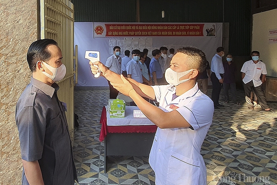 | Cán bộ y tế thực hiện công tác đo thân nhiệt trước khi vào bầu cử |