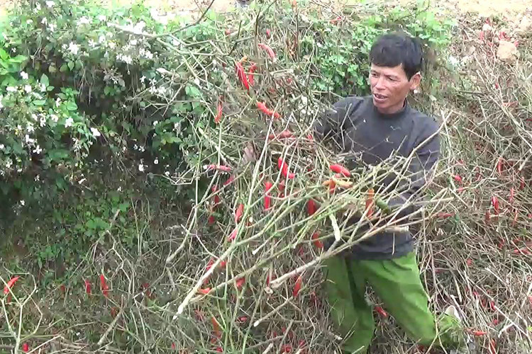 | Ớt chín đỏ trên cây nhưng doanh nghiệp không đến thu mua nên người dân phải phá bỏ |