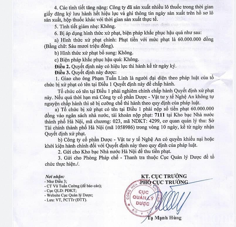 Với các tình tiết này, Công ty CP Dược - Vật tư y tế Nghệ An bị xử phạt hành chính với mức phạt là 60 triệu đồng.
