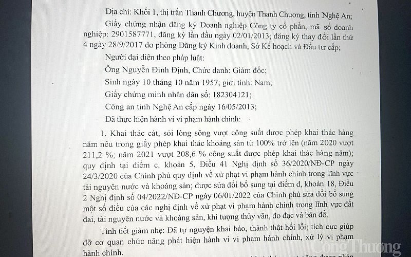 Theo đó, Hợp tác xã này được cấp phép khai thác cát trên sông Lam, đoạn qua huyện Nam Đàn. Tuy nhiên, qua kiểm tra, hợp tác xã này đã khai thác cát lòng sông vượt công suất được phép khai thác hàng năm nêu trong Giấy phép khai thác khoáng sản từ 100% trở lên.