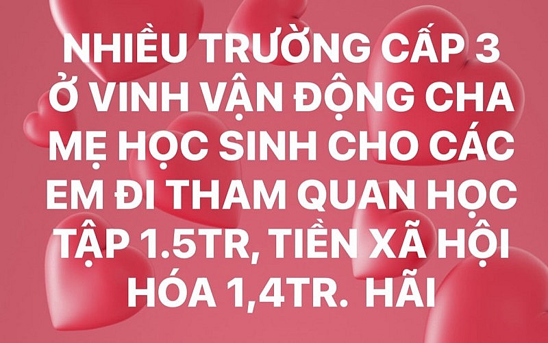 Anh N.D có con theo học một trường THPT trên địa bàn TP. Vinh chia sẻ trên mạng xã hội “nhiều trường cấp 3 ở Vinh vận động cha mẹ học sinh cho các em đi tham quan học tập 1,5 triệu đồng, tiền xã hội hoá 1,4 triệu đồng...hãi…”.
