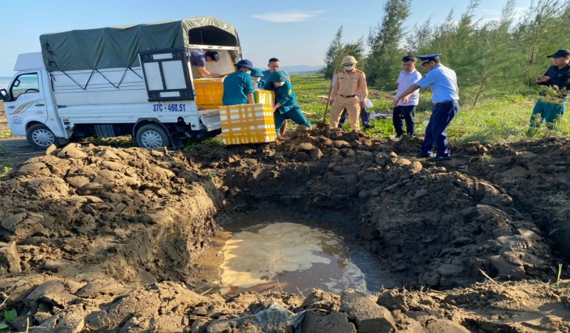 Đội Quản lý thị trường số 1 (đóng tại huyện Diễn Châu) phối hợp với lực lượng chức năng tiêu hủy hàng hóa vi phạm |