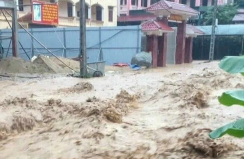 | Nước lũ tại Trung tâm chính trị huyện Kỳ Sơn vào sáng nay 27/9 |