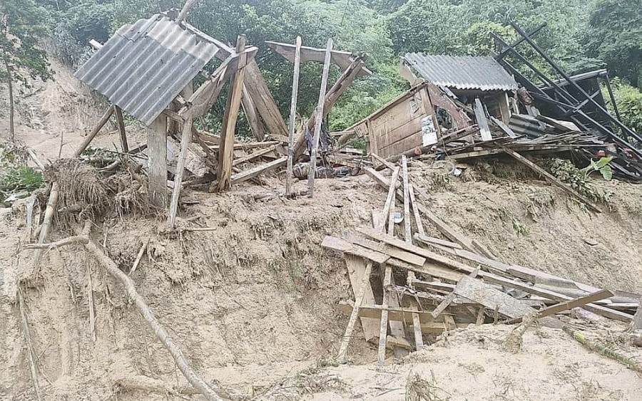 | Mưa lũ càn quét qua xã Bảo Nam, khiến nhiều căn nhà đổ sập |