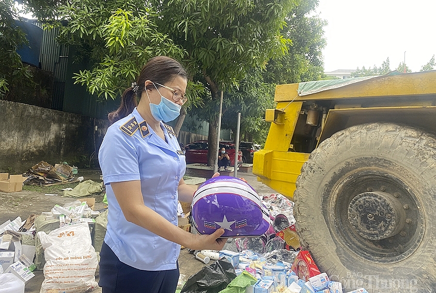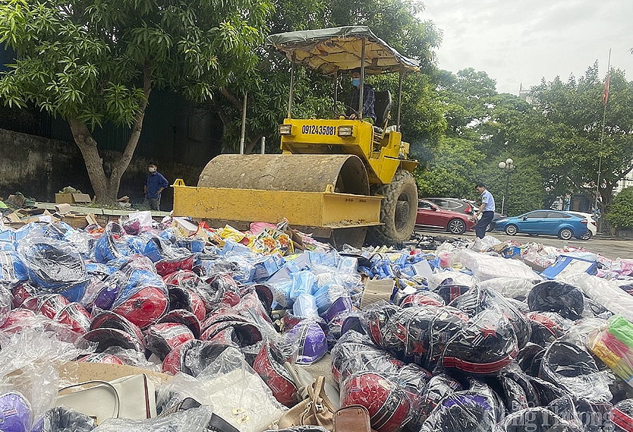 | Trong số hàng hóa bị tiêu hủy chủ yếu là sản phẩm giày dép, quần áo, mũ bảo hiểm, linh kiện điện tử và nhiều mặt hàng không đảm bảo an toàn thực phẩm... |