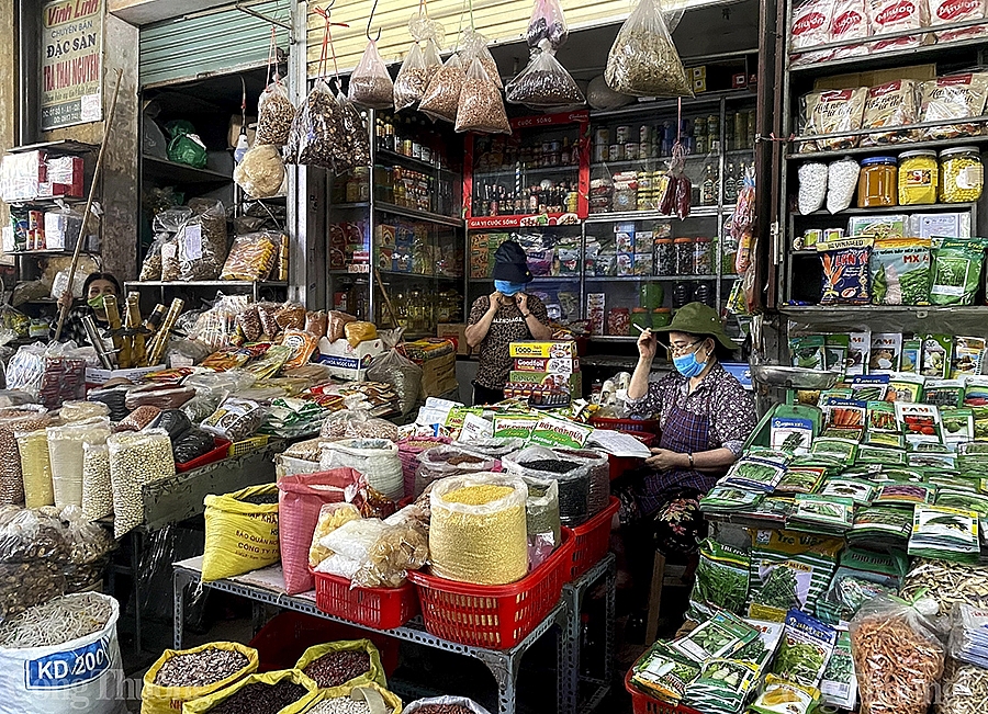 | Tiểu thương kinh doanh đồ khô tại chợ Vinh (Nghệ An) ngóng khách. |