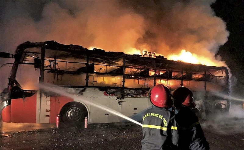 Do xe khách có chứa nệm và nhiều chất dễ bén nên ngọn lửa lan nhanh. Lực lượng cứu hỏa dùng vòi rồng phun nước, khoảng 15 phút sau đám cháy được khống chế, song toàn bộ chiếc xe đã bị cháy rụi.