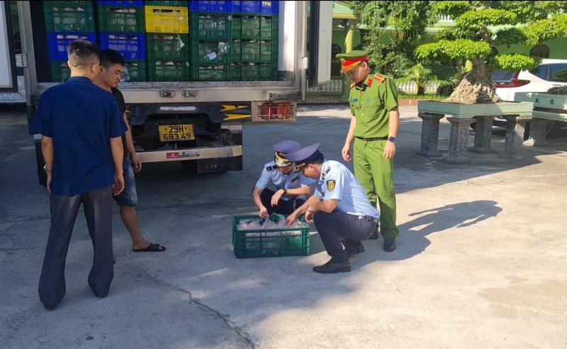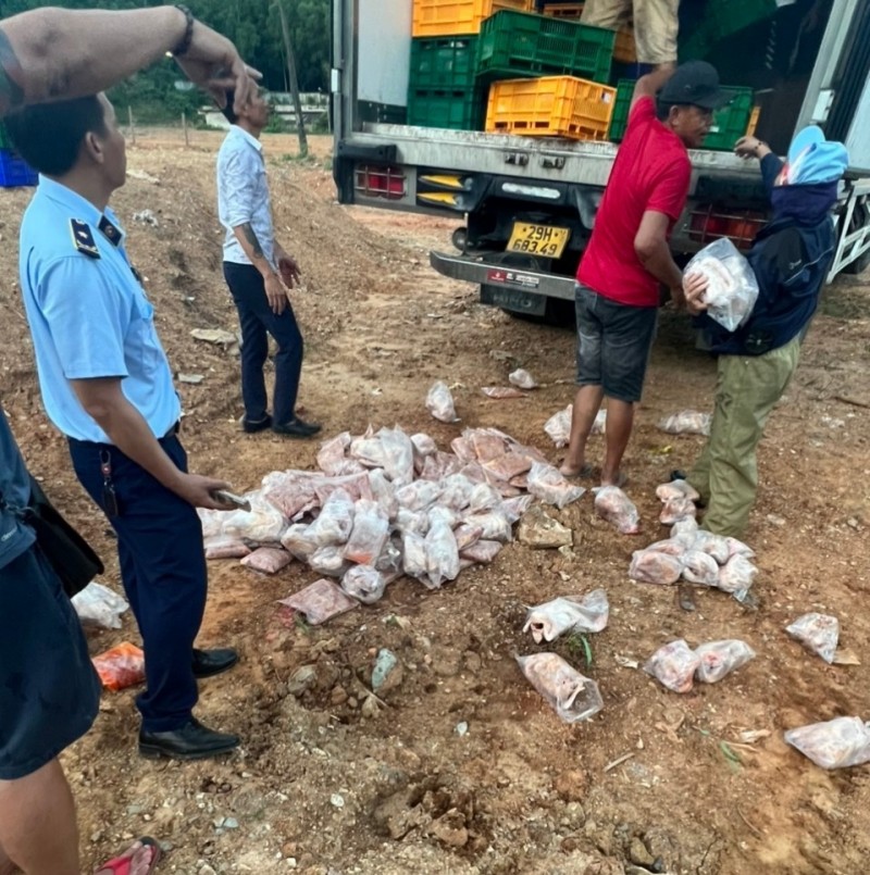 Qua kiểm tra trên xe có vận chuyển 8.000 kg sản phẩm gia cầm là thịt gà đông lạnh không rõ nguồn gốc xuất xứ, đã bốc mùi hôi thối, không đảm bảo an toàn thực phẩm.