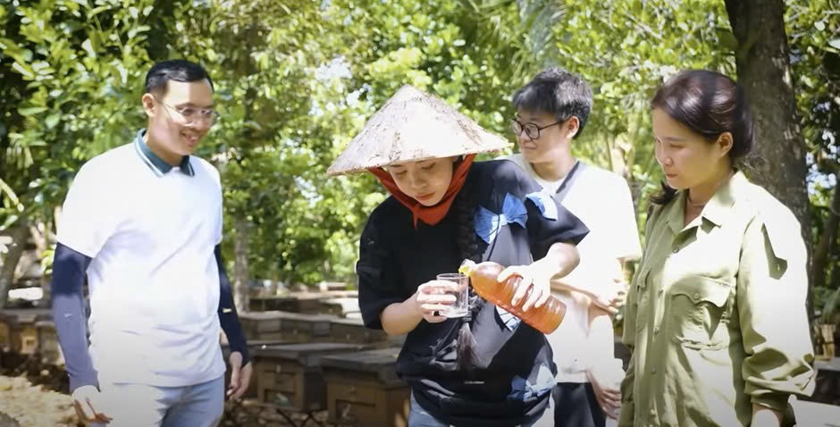 Hằng Du Mục và team đã tham quan trải nghiệm sản phẩm mật ong, sầu riêng và khoai lang ngay tại vườn. Khi bước đến vườn sầu riêng của chú Quốc Hùng, Hằng Du Mục đã có rất nhiều băn khoăn, trái sầu riêng tại vườn ngon như vậy chưa từng được bán trên sàn thương mại điện tử nào?