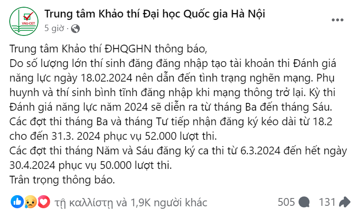 Đến chiều cùng ngày, trên fanpage Trung tâm Khảo thí, ĐHQGHN đăng thông báo: "Do số lượng lớn thí sinh đăng nhập tạo tài khoản thi đánh giá năng lực ngày 18/2 nên dẫn đến tình trạng nghẽn mạng. Phụ huynh và thí sinh bình tĩnh đăng nhập khi mạng thông trở lại".