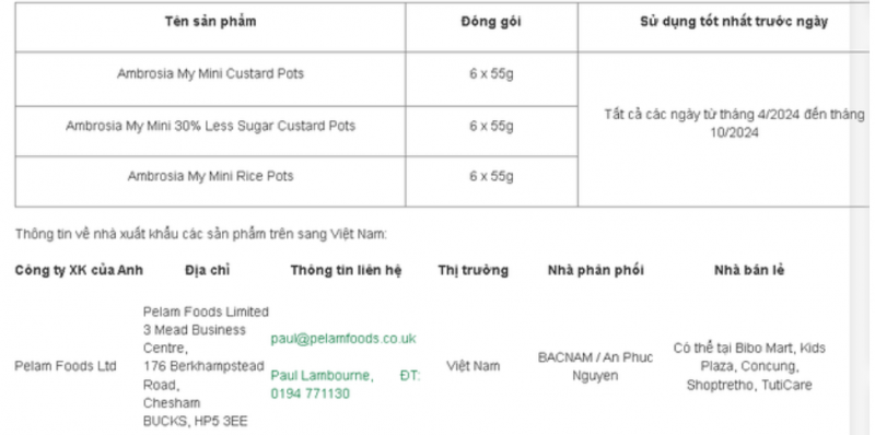 Cục An toàn thực phẩm (Bộ Y tế) vừa nhận được thông tin từ Cơ quan Tiêu chuẩn thực phẩm Anh về việc Công ty Premier Foods đang thu hồi các sản phẩm váng sữa Ambrosia My Mini Pots do có thể chứa các mảnh nhựa. Các sản phẩm này đã được nhập khẩu về Việt Nam.