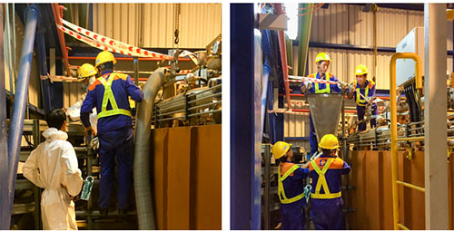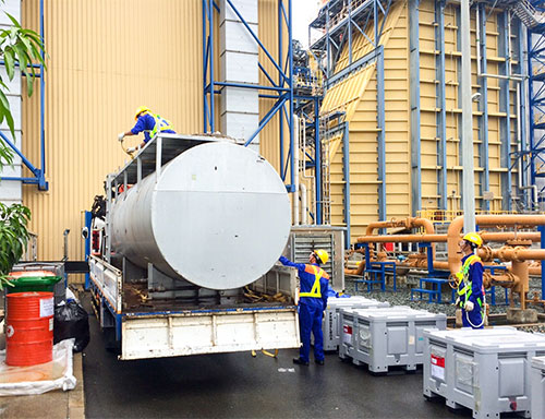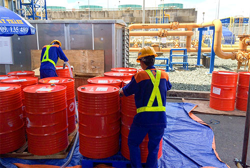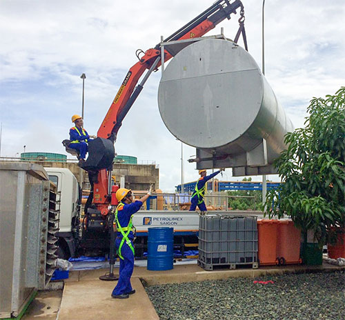 | Công đoạn hạ bồn chứa tạm dầu nhờn vào khu vực quy định |