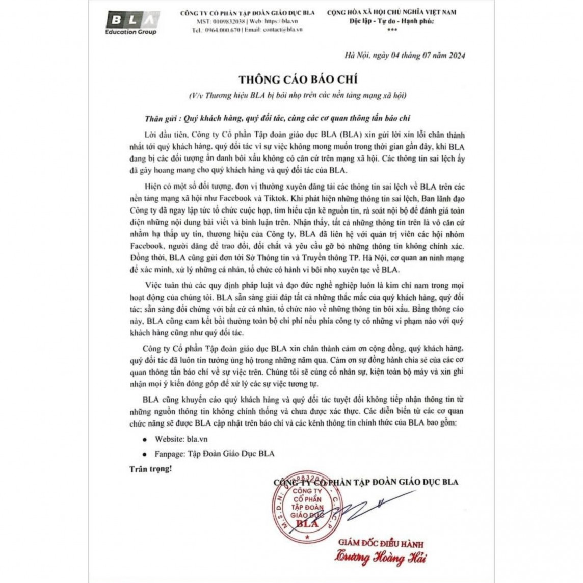 | BLA Education Group sau khi có những thông tin chưa kiểm chứng trên mạng xã hội đã ra thông cáo báo chí. ( Ảnh: bla.vn) |