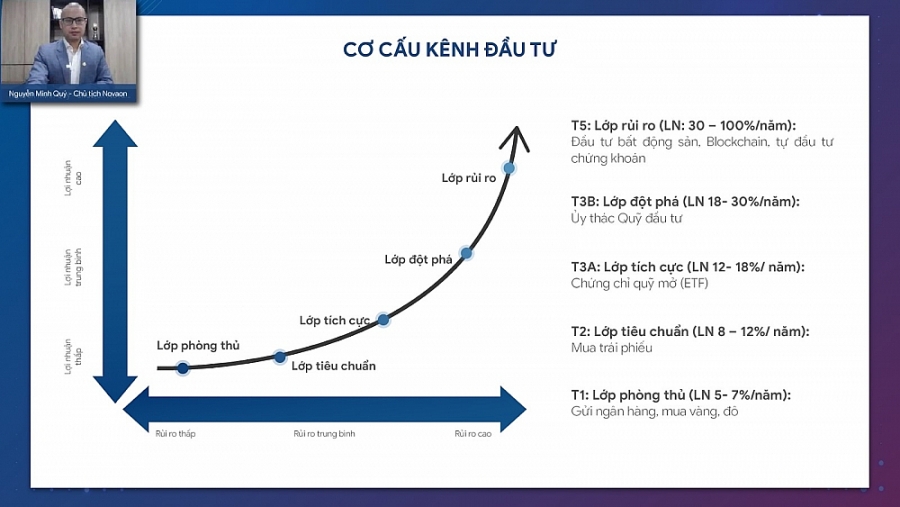 Ngoài ra, xác định khẩu vị rủi ro cũng là điều quan trọng để quyết định chiến lược đầu tư phù hợp. Lợi nhuận càng cao, rủi ro đi kèm càng lớn, nhà đầu từ kỳ vọng hưởng lãi suất lớn phải chấp nhận rủi ro đi kèm tương ứng. Vị chuyên gia từ Novaon Capital chỉ ra 5 lớp đầu tư phổ biến, sắp xếp theo chiều tăng dần của lợi nhuận và rủi ro.