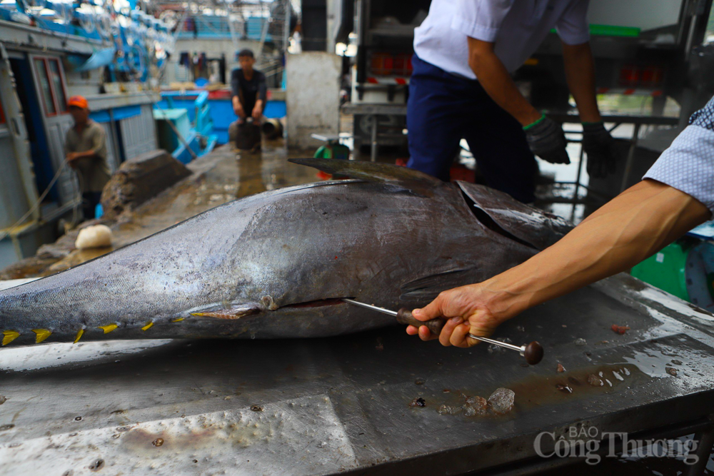 Tại cảng, chủ tàu chỉ bán sỉ cho doanh nghiệp, không bán lẻ cá ngừ. Do đó, khi cá cập cảng, nhân viên kỹ thuật của công ty thu mua tới cân, kiểm tra chất lượng thịt cá tại chỗ.