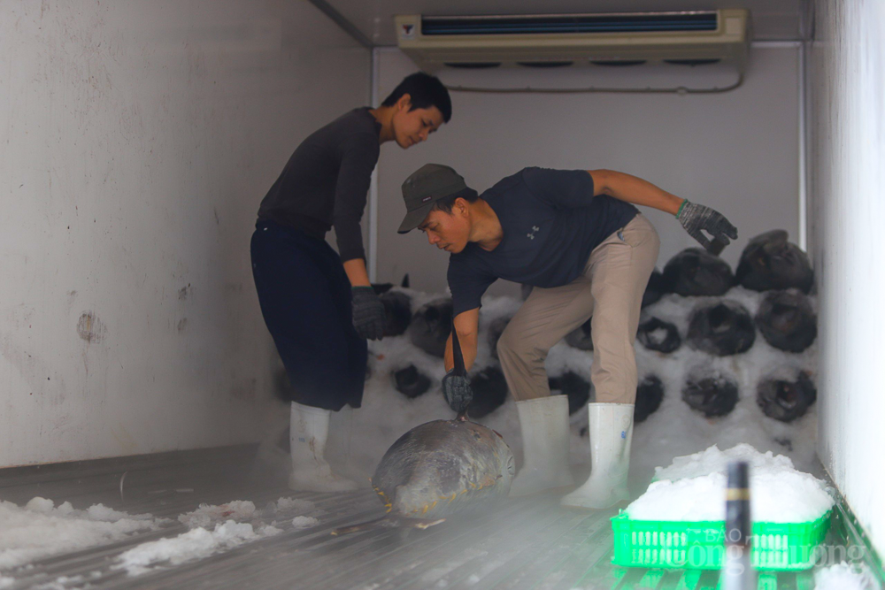 Sau khi cân, cá được xếp gọn gàng trong xe đông lạnh với đá xay nhuyễn để ướp đảm bảo độ tươi trước khi vận chuyển.