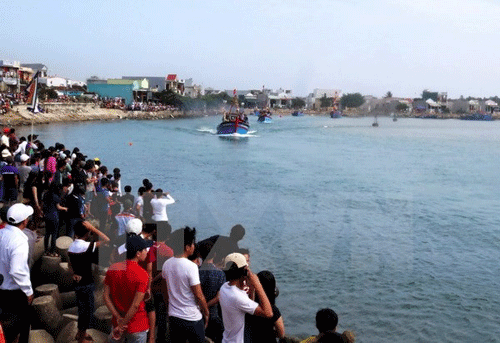 Tàu thuyền nối đuôi nhau ra khơi trước sự cổ vũ của đông đảo người xem. (Ảnh: Phước Ngọc/TTXVN)