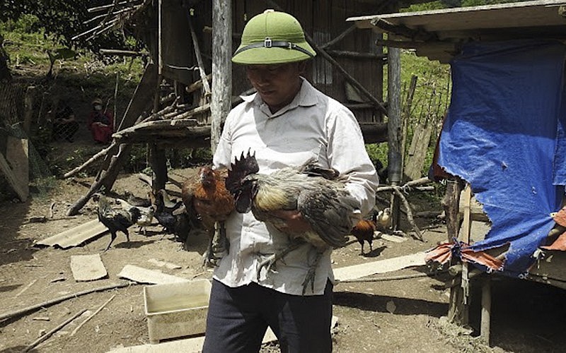 Ông Vừ Tồng Pó ở bản Mường Lống 1, xã Mường Lống, huyện Kỳ Sơn bên trang trại nuôi gà của gia đình mình