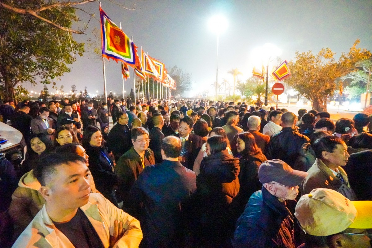 | Đoàn đại biểu xếp hàng chờ kiệu rước ấn từ đền Cố Trạch sang đền Thiên Trường |