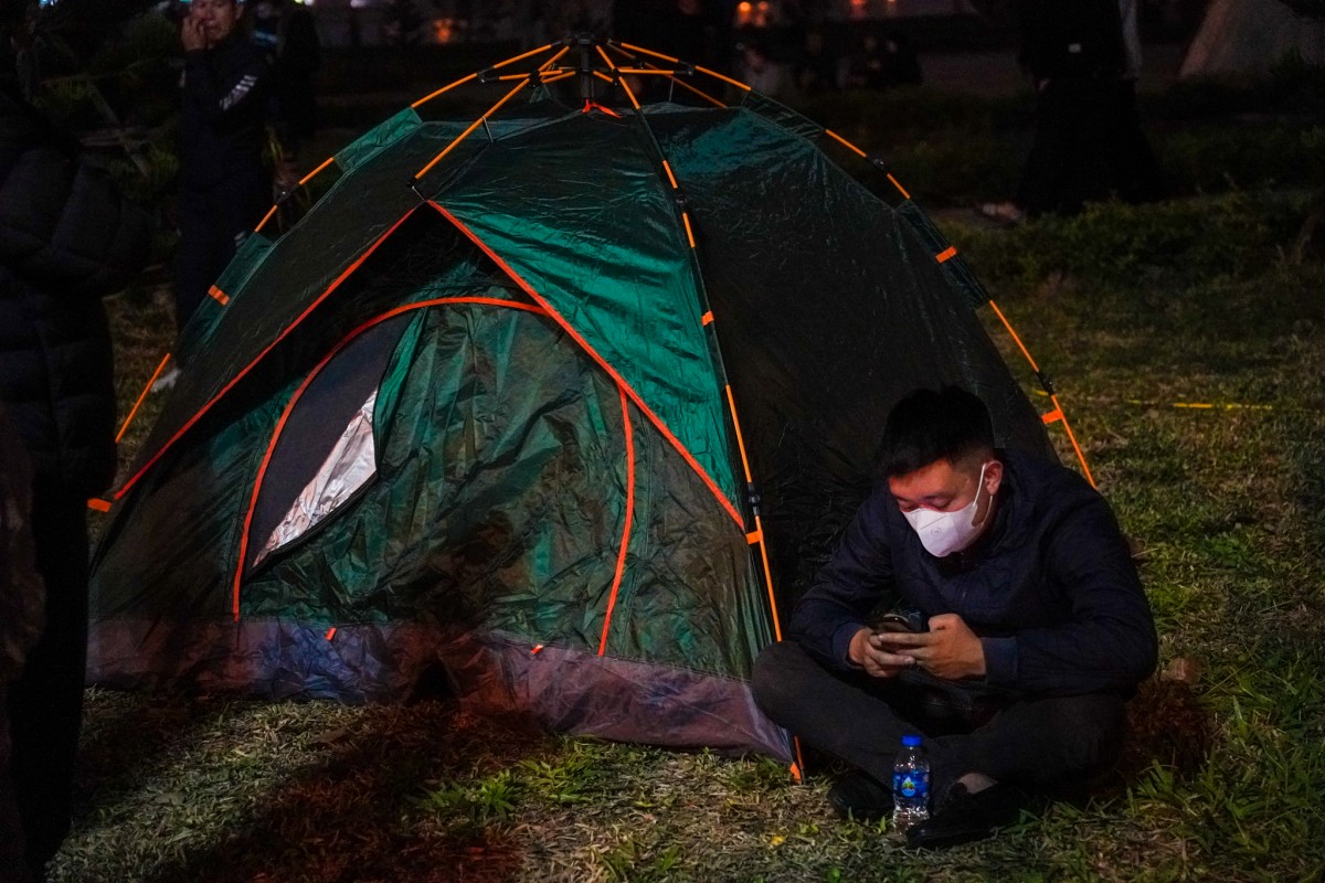 | Nhiều người dân căng lều để chống lạnh, chờ khai ấn đền Trần |