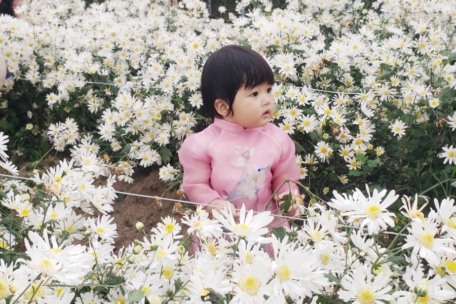 | Các em nhỏ được bố mẹ diện cho những bộ áo dài truyền thống xúng xính bên vườn hoa cúc họa mi |