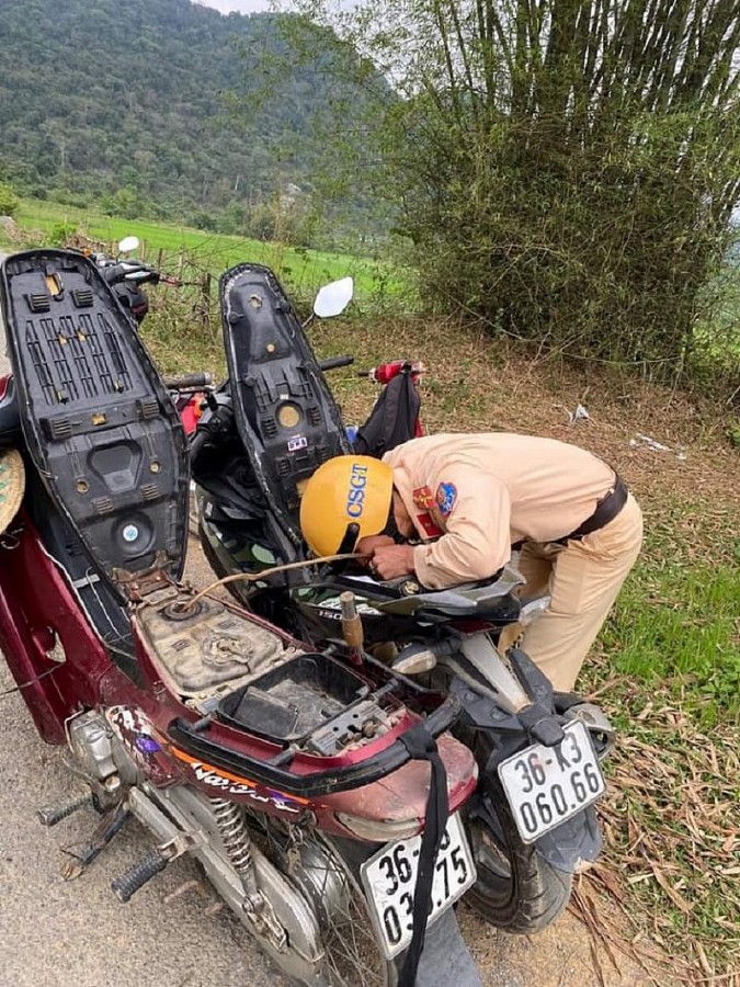 Theo Thượng tá Bùi Văn Huy, trưa 28/3/2023, tổ tuần tra kiểm soát bảo đảm trật tự an toàn giao thông trong khi đang làm nhiệm vụ trên tuyến đường liên xã Thanh Lâm thì phát hiện chị Vi Thị Hồng đang đẩy xe máy hết xăng chở theo nhiều củi rất nặng nhọc.