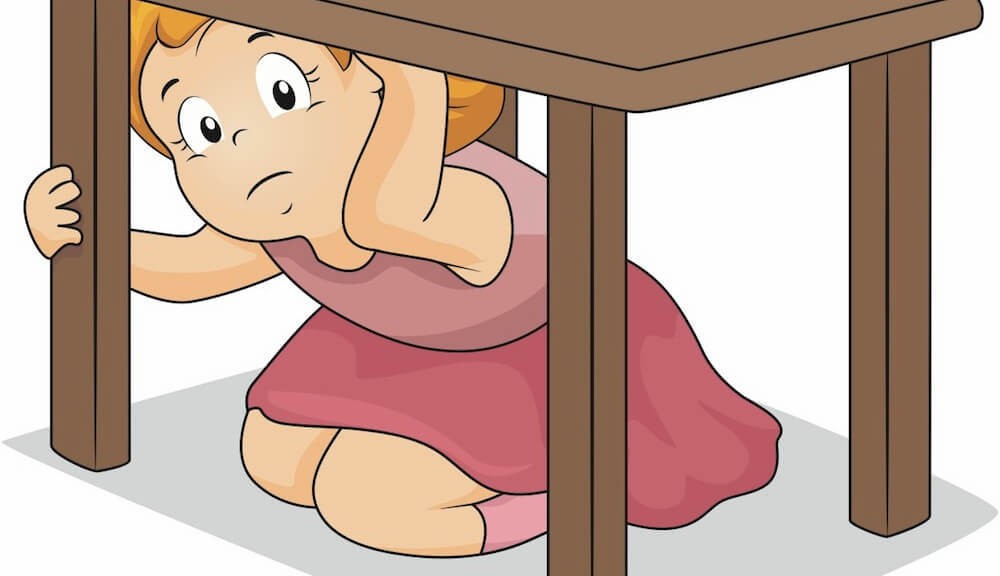 Khi rung chấn bắt đầu, nếu đang ở trong nhà hoặc những lớp học kiên cố chắc chắn, hãy sử dụng ngay những vật cứng che đầu; núp dưới gầm bàn hoặc các tủ đồ gỗ cho đến khi rung chấn kết thúc để tránh các đồ vật rơi xuống làm bị thương.